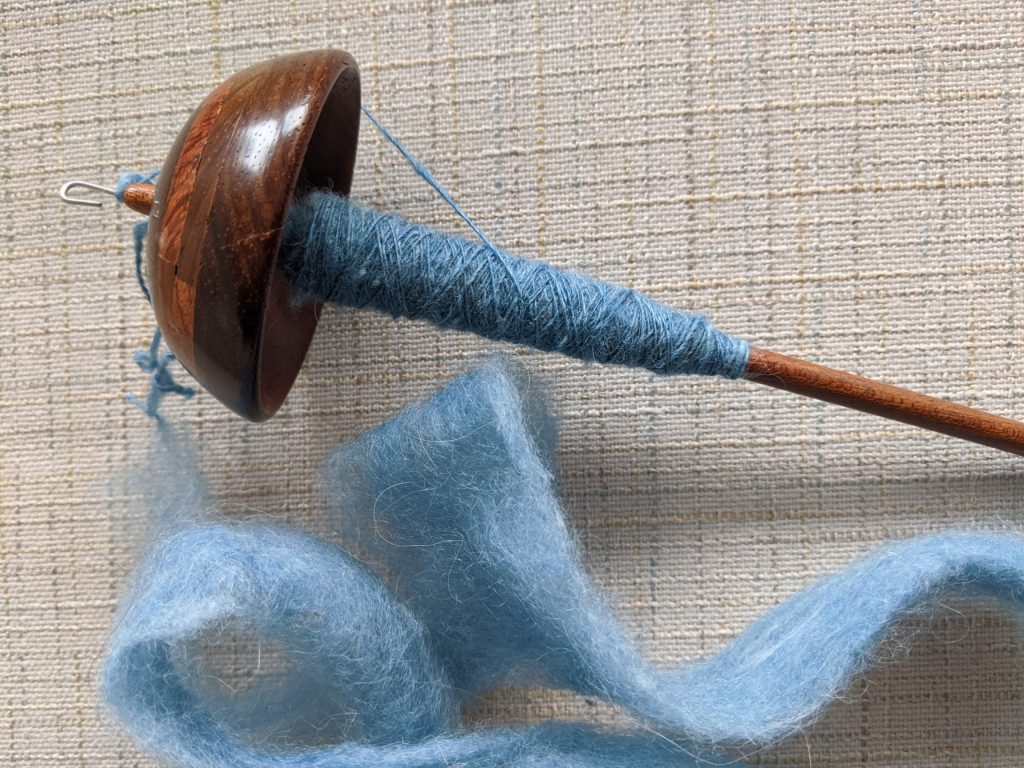 What I’m talking about here is diversity. In this case, it’s diversity of posture. But there are lots of other ways to introduce diversity to your knitting. In my current projects, I’m working with lightly spun Icelandic wool – very low crimp, somewhat coarse, and very lightly spun, and the other mystery project is being knit out of handspun light fingering yarn which is a blend of Rambouillet and angora, spun with a robust twist. This is a decidedly bouncy yarn especially as compared to the lopi. The diversity of fiber properties (crimp), yarn construction (thick singles vs light fingering 3-ply, amount of twist in both the singles and the finished yarn) creates a more diverse range of work that my hands and forearms will need to perform.